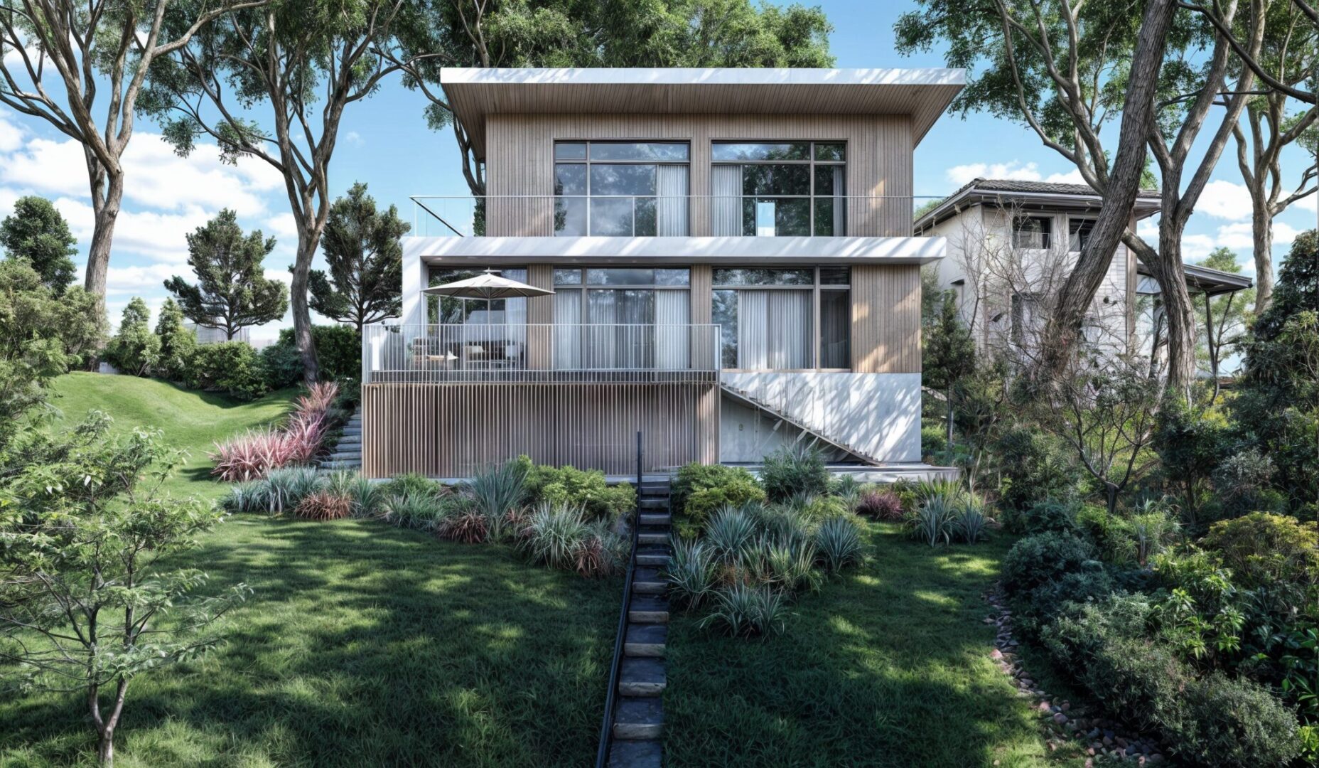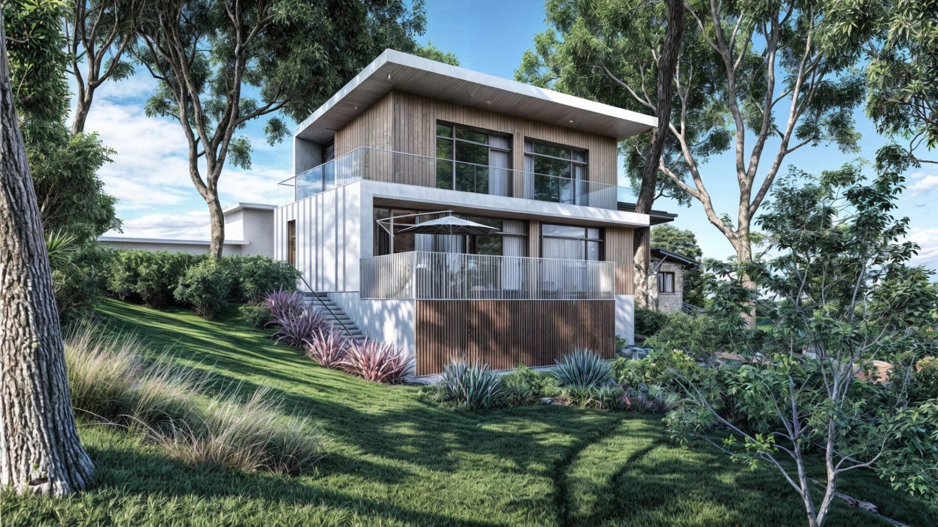 Na szczycie działki stanowiącej drugą linię zabudowy od linii brzegowej Zalewu Zegrzyńskiego , w miejscu dotychczasowych zabudowań gospodarczych zaprojektowaliśmy dom dla Inwestorów którzy cenią sobie rodzinne spotkania w szerokim gronie. Warunki widokowe działki wymusiły konkretną formę budynku i jego otwarcie w kierunku wody (południowym). Z racji na duże wyeksponowanie obiektu na wiatr i cięższe warunki atmosferyczne zastosowaliśmy elewację wentylowana z paneli na rąbek stojący.