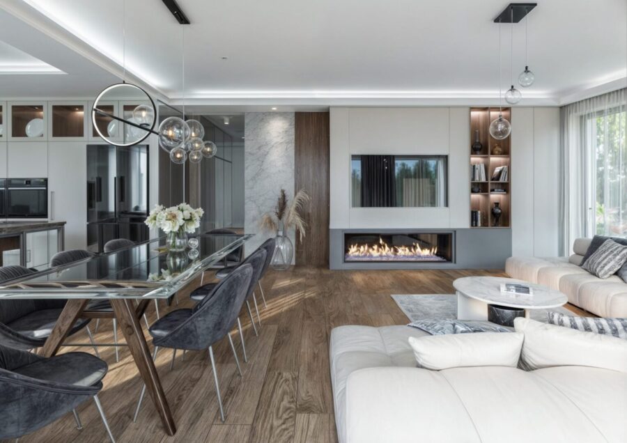Projekt wnętrza apartamentu czteropokojowego z kuchnią otwartą na część dzienną, zaprojektowany został w jasnej, beżowo – szarej kolorystyce z elementami drewnianymi. Harmonijną i przytulną przestrzeń dopełnia kominek w salonie oraz oświetlenie punktowe.