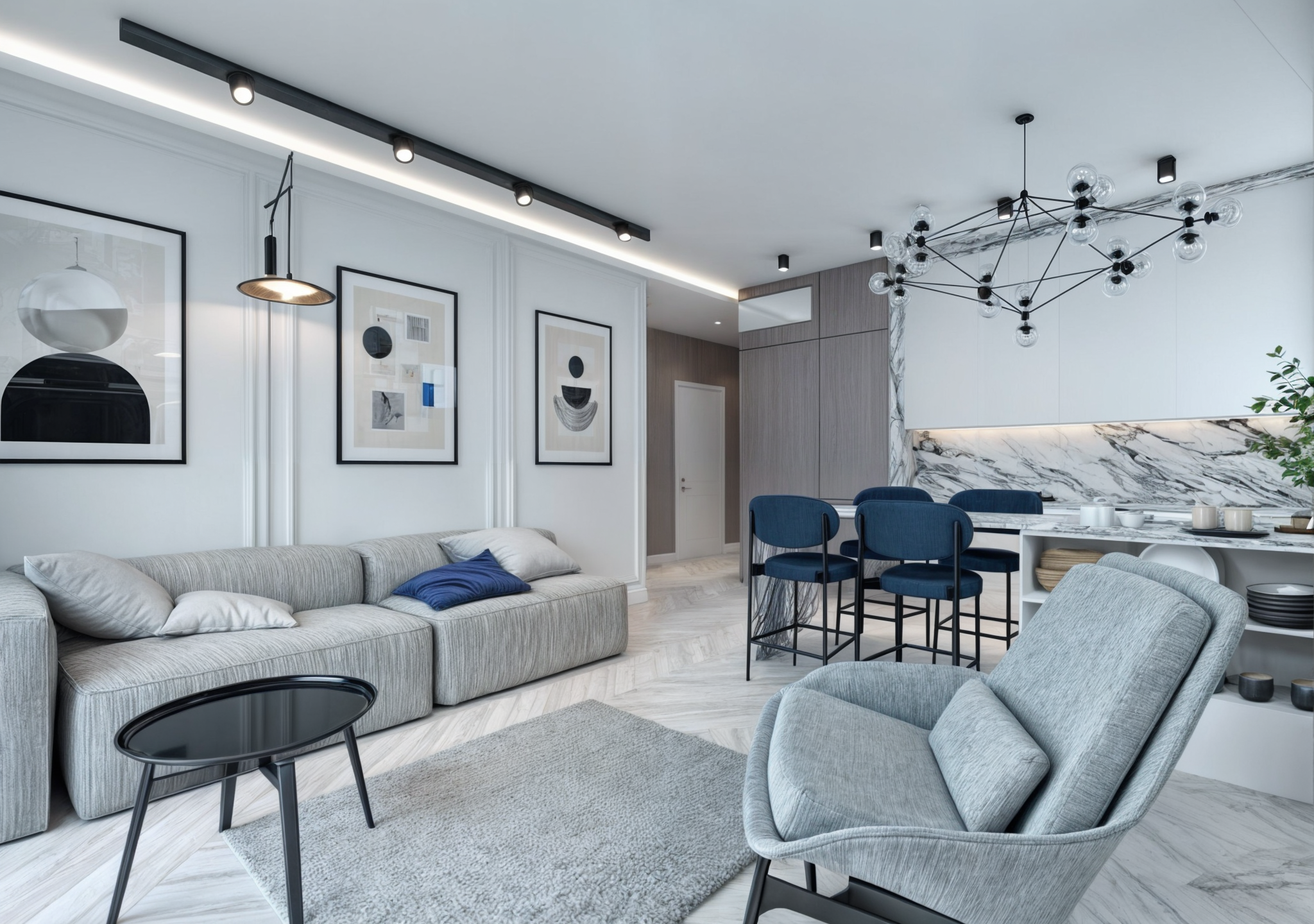 Projekt trzypokojowego mieszkania na parterze z wyjściem na ogród. Otwarty salon z aneksem kuchennym oraz sypialnie utrzymane są w jasnej, biało-szarej kolorystyce, przełamanej elementami brudnego różu oraz błękitu.