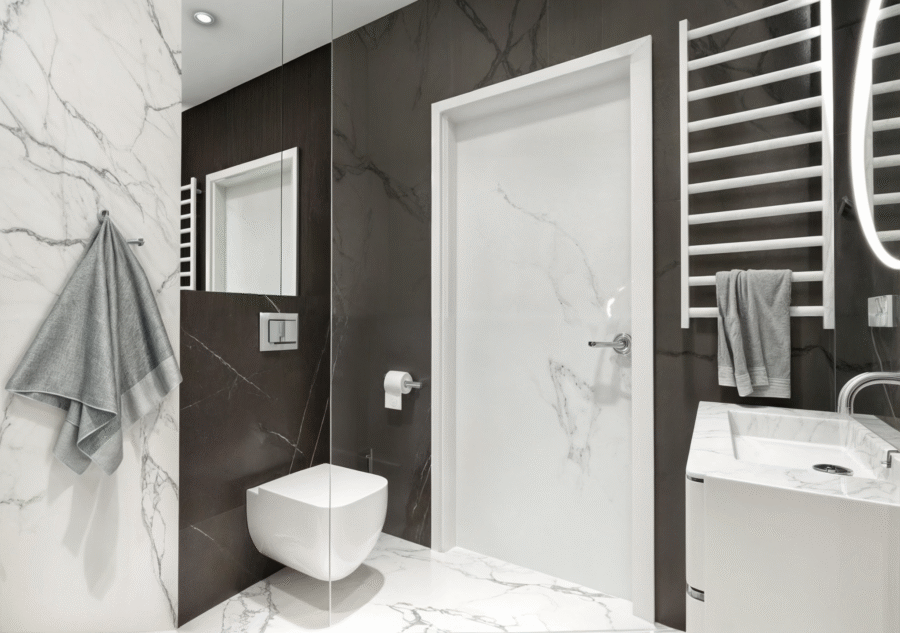 Charakterystycznym i praktycznym elementem aranżacji wnętrza są szafy w zabudowie, występujące w holu oraz obu sypialniach. Drzwi do jednej z sypialni to tzw. drzwi ukryte, są spójne kolorystycznie ze ścianą.
