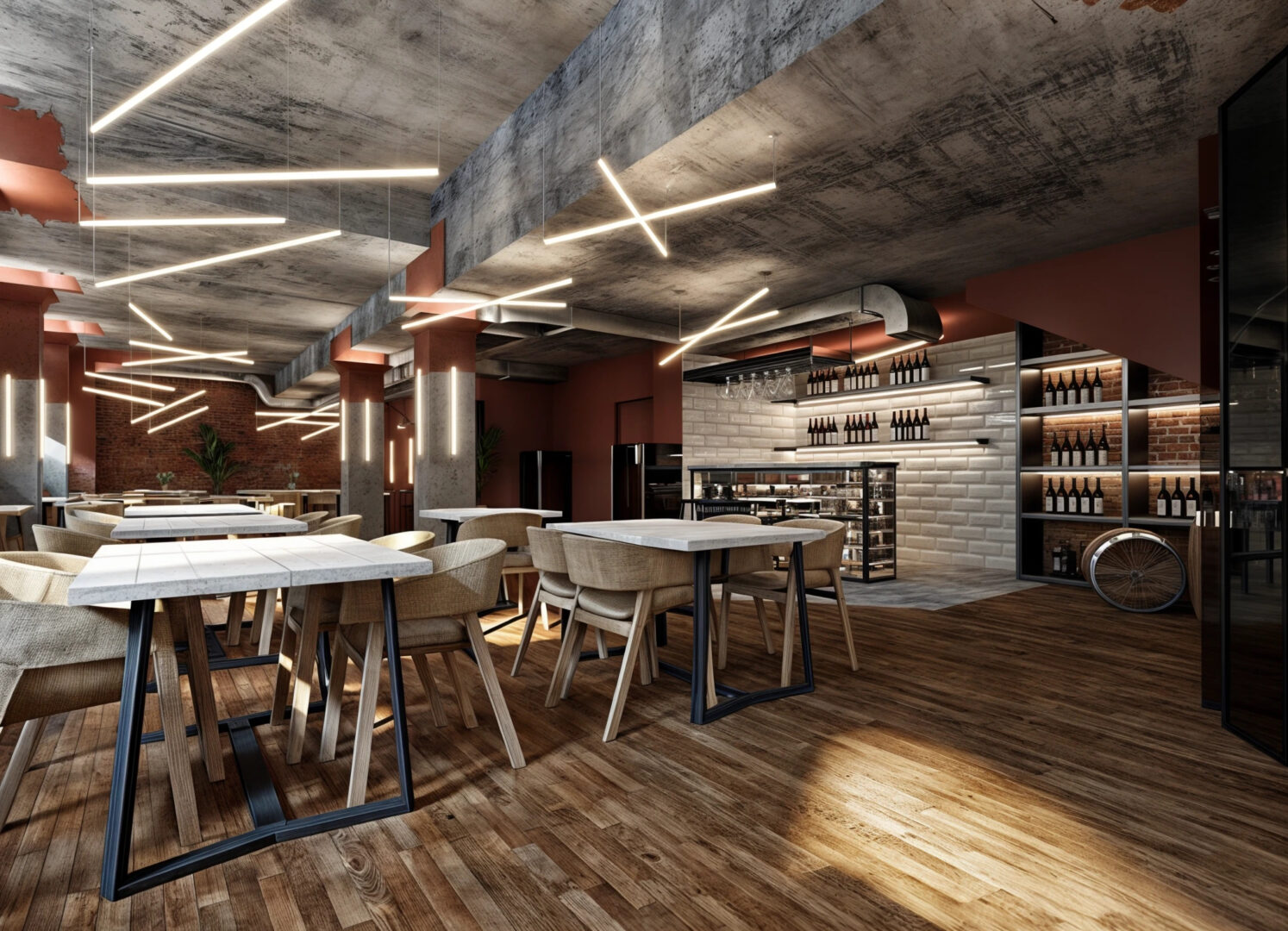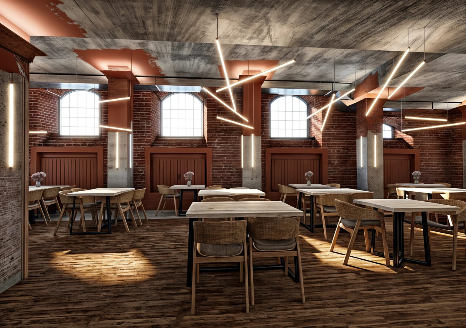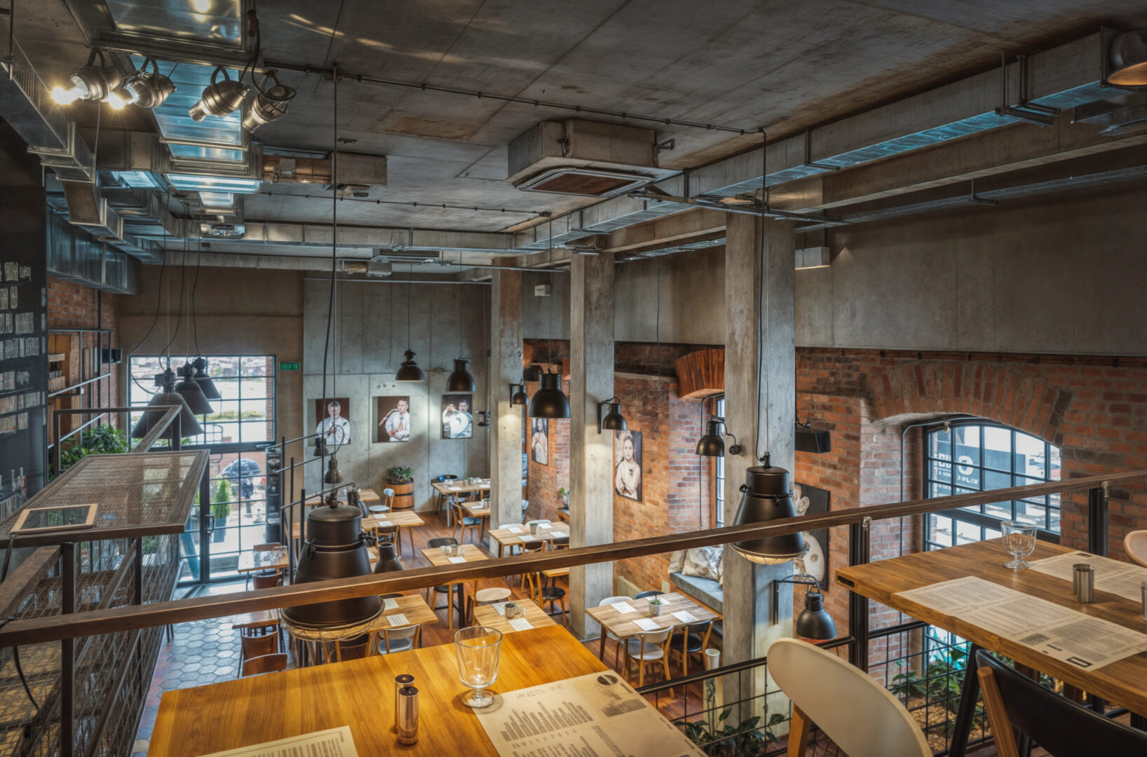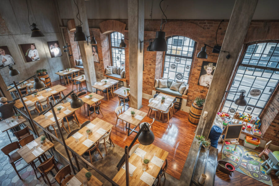 Restauracja ma aż 3 poziomy dostępne dla gości, zaczynając od sutereny przewidzianej na przyjmowanie zamkniętych wydarzeń towarzyskich, przez ogólnodostępny parter po antresolę przystosowaną do spotkań biznesowych. Wielkość lokalu zapewniła miejsce dla  zaproponowania atrakcji w postaci otwartej kuchni na potrzeby przygotowywania pizzy, strefy baru oraz przestrzeni dla gości. Z szacunku dla tektoniki budynku, i jego elementów zabytkowych staraliśmy się nie konkurować wystrojem, odsłaniając naturalne materiały konstrukcyjne w postaci cegły i betonu.
